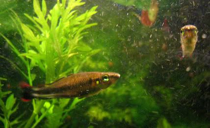 longhairedgit![]() ![]() ![]() ![]() ![]() Fish Guru Lord of the Beasts Posts: 2502 Kudos: 1778 Votes: 29 Registered: 21-Aug-2005 ![]() | Just for those interested in how it all happens prior to successful breeding , here it is. 1) the heavily gravid female finally approaches two males who have been partially displaying all morning (it is now 7.00 in the evening.) Presumably she gives then a knowing wink.lol. http://i12.photobucket.com/albums/a245/longhairedgit/IMG_4775.jpg 2 ) the males kickoff in earnest, starting with a bit of synchronised swimming, never more than about 5 inches apart, and usually closer than two. http://i12.photobucket.com/albums/a245/longhairedgit/IMG_4802.jpg 3)Watch this- the males start spinning around, tail to tail getting ever closer. http://i12.photobucket.com/albums/a245/longhairedgit/IMG_4787.jpg 4)They are swimming closer, touching regularly, they both begin to enhance their orange lateral colouration (sorry it doesnt show up on the pic- its very subtle.)Note the female at the bottom of the picture who actually circles at a distance of about 1 foot during the entire courtship ritual. http://i12.photobucket.com/albums/a245/longhairedgit/IMG_4777.jpg 5)Oi! Ref! Theres a little bite here and there, no wounds, but probably not painless. The more dominant fish generally makes the first bite. http://i12.photobucket.com/albums/a245/longhairedgit/IMG_4799.jpg 6)They perform a t-bone formation, always staying at right angles, as if daring each other to fight on, its a game of bluff. http://i12.photobucket.com/albums/a245/longhairedgit/IMG_4793.jpg 7)The loser finally concedes victory and is chased off.The winner mates with the female who hangs around him for several minutes before allowing fertilisation of the eggs http://i12.photobucket.com/albums/a245/longhairedgit/IMG_4788.jpg ps I didnt take piccies of the actual mating as it might disturb them and the female is so heavily gravid that I need her to vent the eggs asap. I will get you some pics of the actual spawn at a later date. Hope that showed you something about rainbow courtship! ![]() Last edited by longhairedgit at 14-Dec-2005 15:33 |